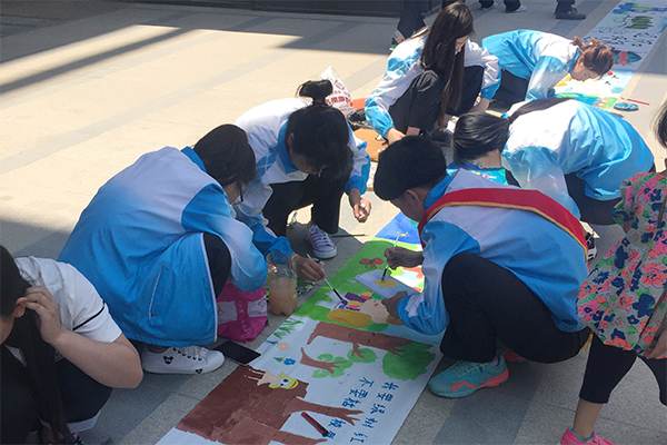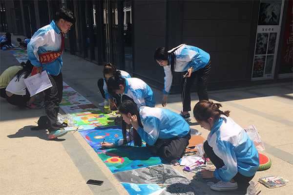 来自学院各分院系100余名学生参加活动,学生们或蹲或坐,迅速调好颜料,很快就进入了创作状态。自上午9时至11时,学生创作的“辽河口环保之行” 百米长卷很快被五色斑斓的图画和文字充满,浑然一体,蔚为壮观。著名艺术家赵世杰、张衍伟、郭建新、蒙健等亲临现场,为长卷画龙点睛,奉献了精美的画作与书法作品。
